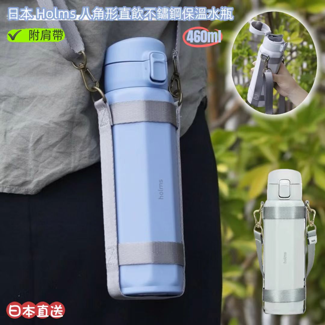 日本 Holms 八角形直飲不鏽鋼保溫水瓶 460ml|真空隔熱|附肩帶|全年適用